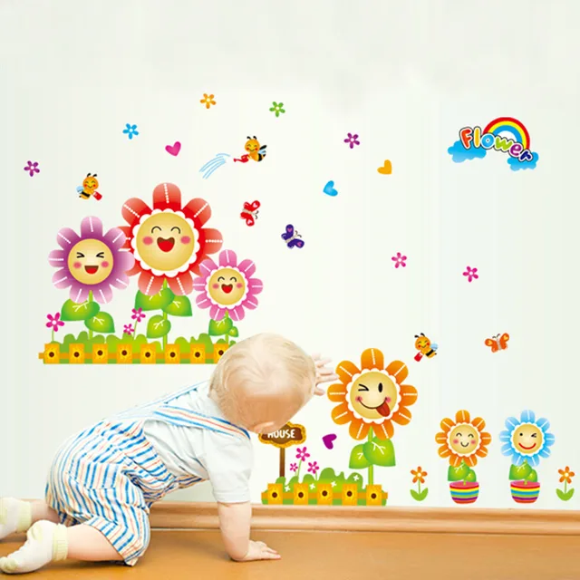 7120 Kartun Bunga Mekar Senyum Bunga Matahari Stiker Dinding Untuk