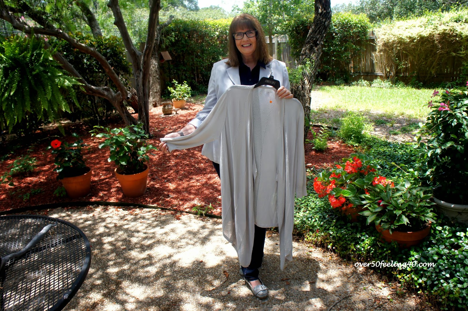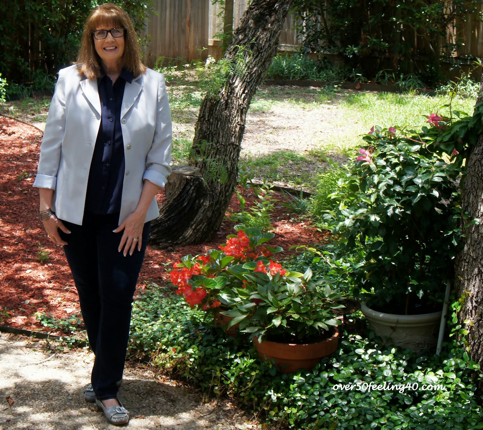 This Jones of New York, gray linen jacket will serve me well for a long time. Here I have paired it with a navy sleeveless top and blue denim. A perfect look for a high school teacher!